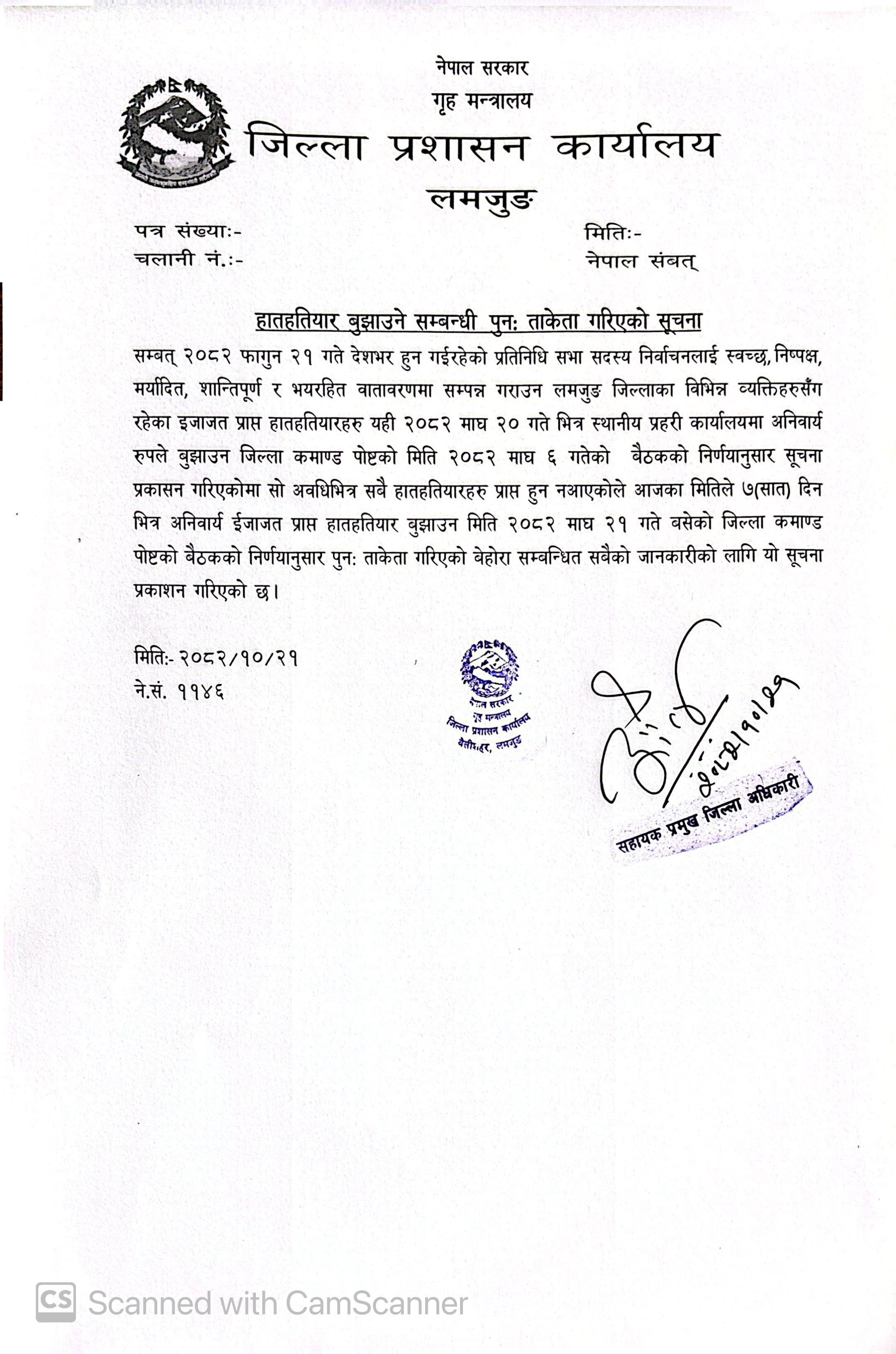 हातहतियार बुझाउने सम्बन्धी पुनः ताकेता गरिएको सूचना।