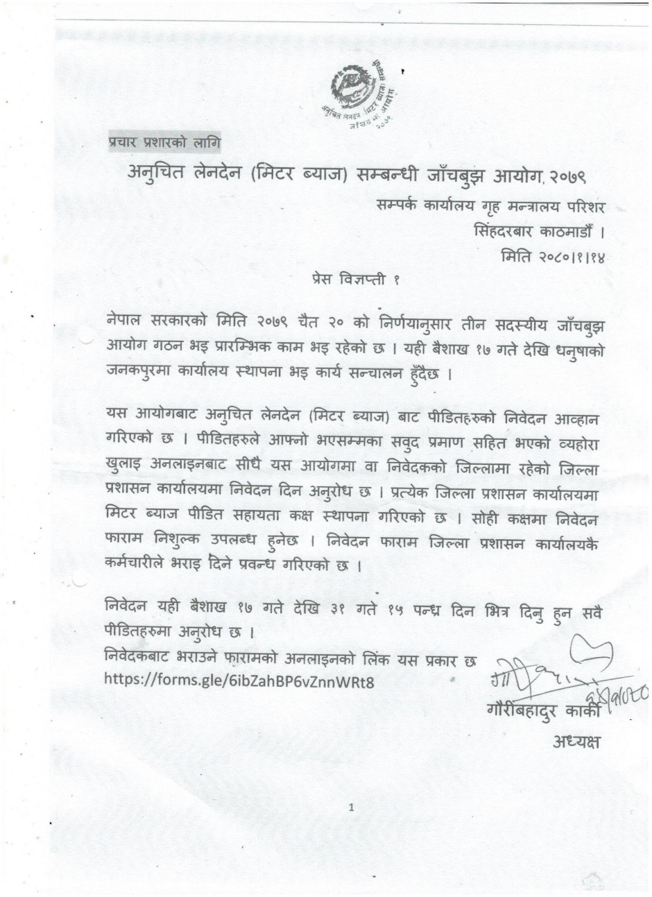 अनुचित लेनदेन (मिटर व्याज) उजुरी सम्बन्धी (प्रेस विज्ञप्ती)