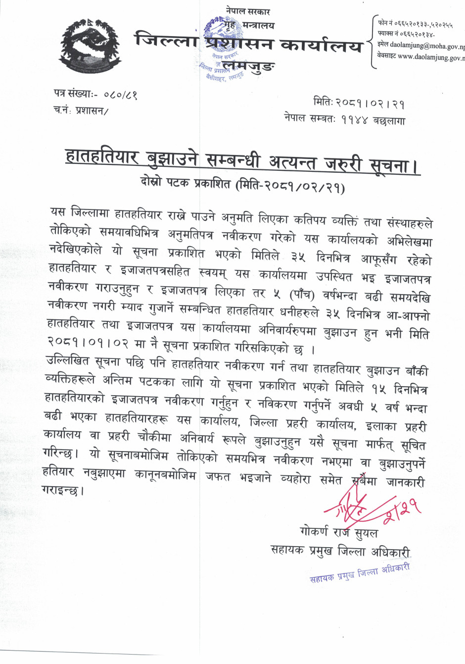 हातहतियार सम्बन्धी अत्यन्त जरुरी सूचना