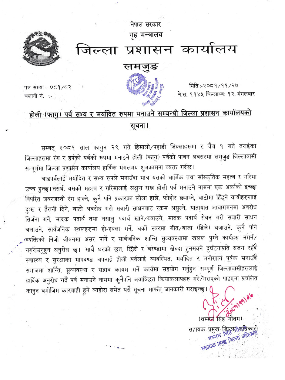 होली पर्व सभ्य र मर्यदित रुपमा मनाउने बारे सुचना