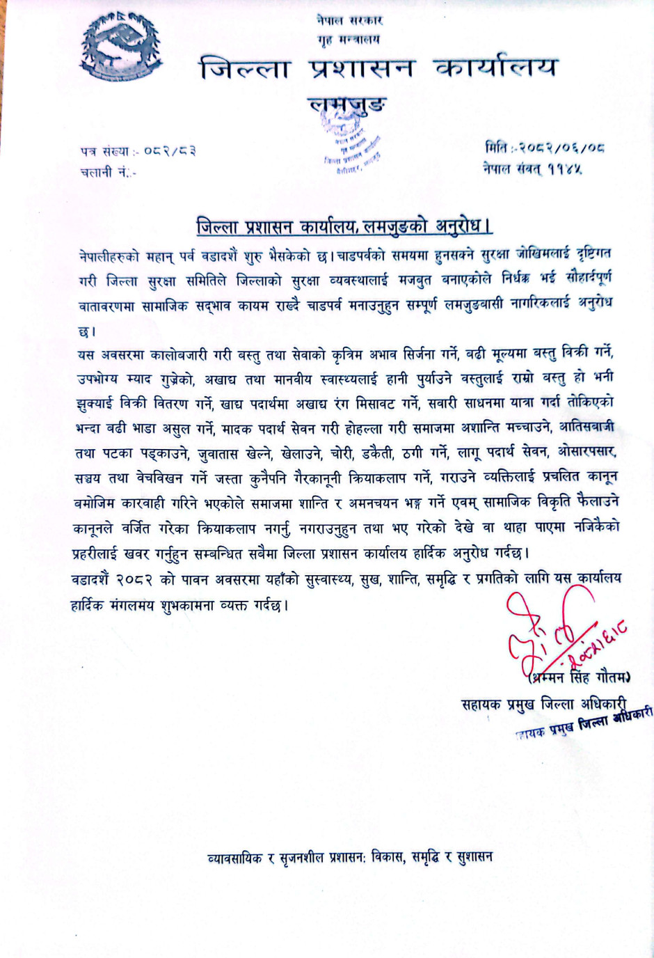 जिल्ला प्रशासन कार्यालय, लमजुङको अनुरोध।
