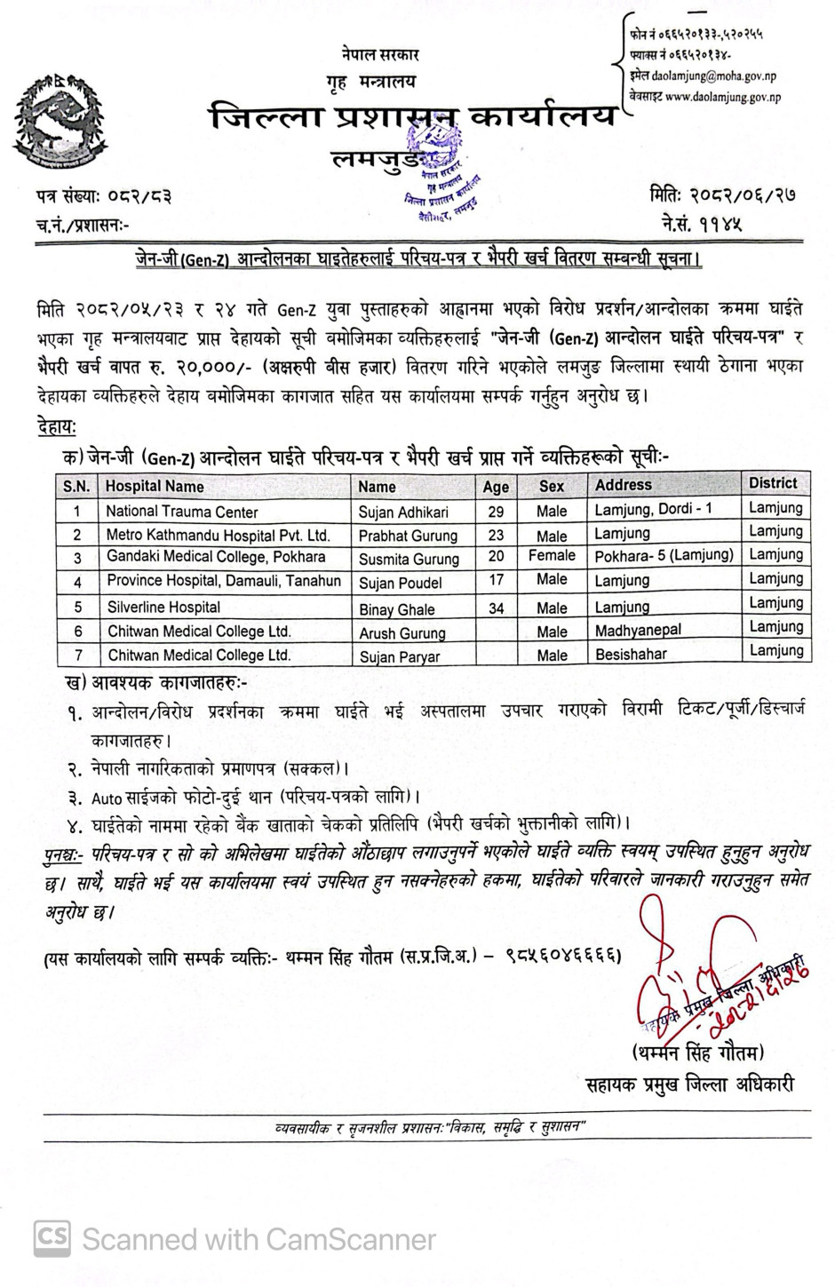जेन-जी (Gen-Z) आन्दोलनका घाईतेहरूलाई परिचय-पत्र र भैपरी खर्च वितरण सम्बन्धी सूचना।