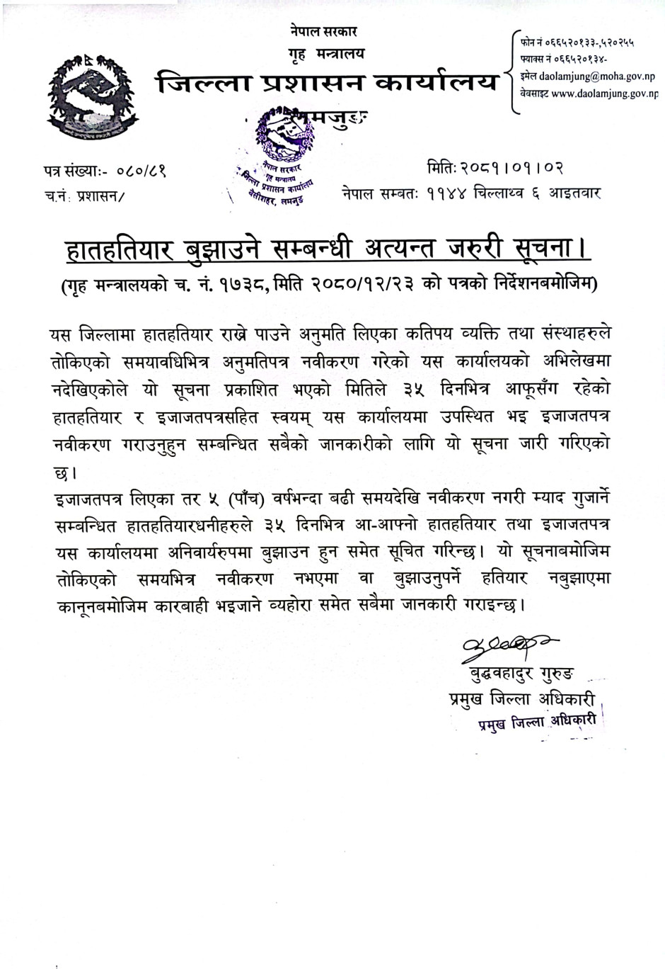 हातहतियार बुझाउने सम्बन्धी अत्यन्त जरुरी सूचना