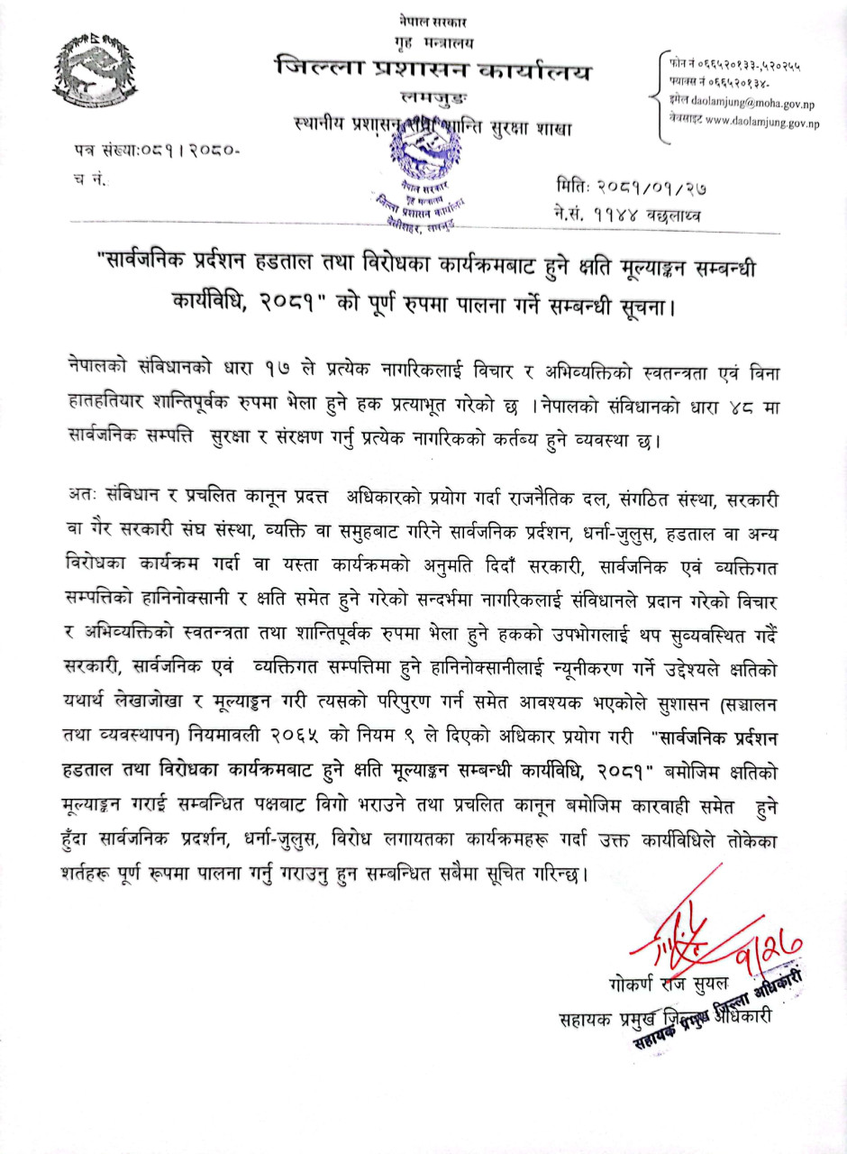 सार्वजनिक प्रदर्शन हडताल तथा विरोधका कार्यक्रमबाट हुने क्षति मूल्याङ्कन सम्बन्धी कार्यविधि २०८१ को पालना सम्बन्धी सूचना