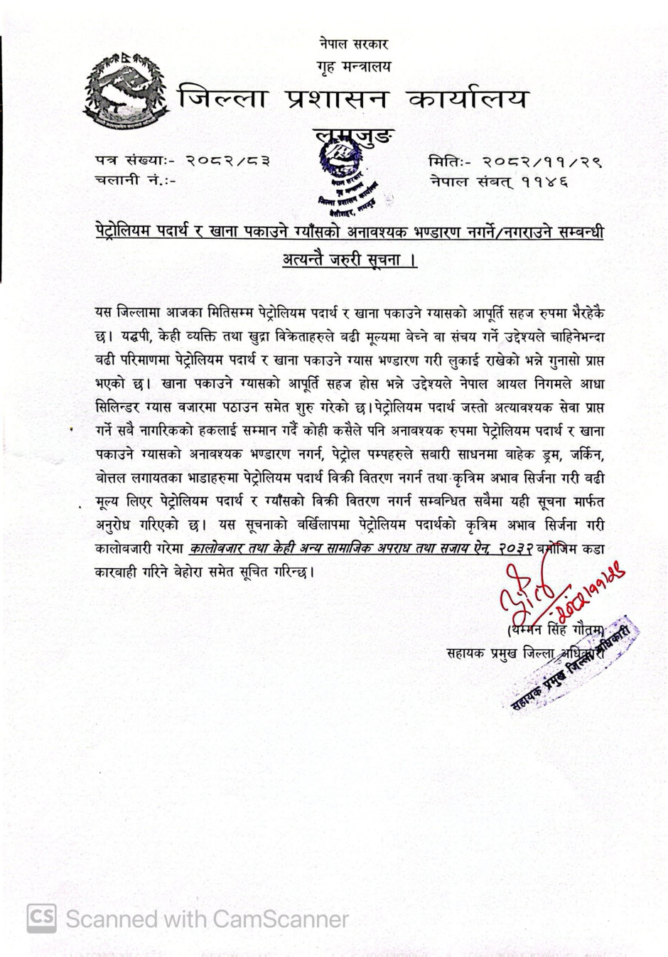 तस्बिर : पेट्रोलियम पदार्थ र खाना पकाउने ग्याँसको अनावश्यक भण्डारण नगर्ने/नगराउने सम्बन्धी अत्यन्तै जरूरी सूचना
